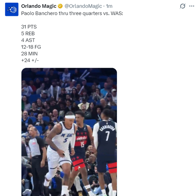 北京时间3月4日,奥兰多魔术队大胜华盛顿奇才队结束二连败。奇才是一支摆烂的球队,上半场只落后魔术三分,可第三节奇才一反常态开始各种眼神防守单节净负13分,末节早早进入垃圾时间。此役班凯罗32分钟就拿到37分追平赛季新高,也是本赛季第六场30+。